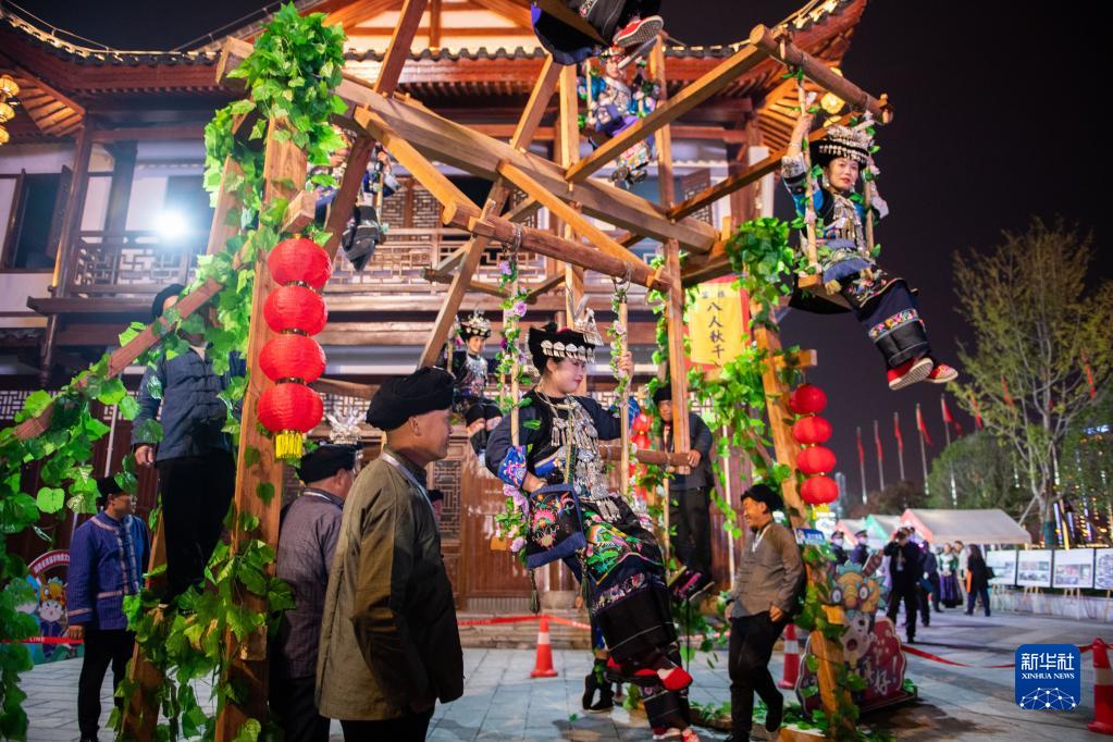 11月18日,在張家界大庸古城舉辦的湖南省首屆非遺博覽會上,工作人員在展示苗族八人秋千。新華社記者陳思汗攝