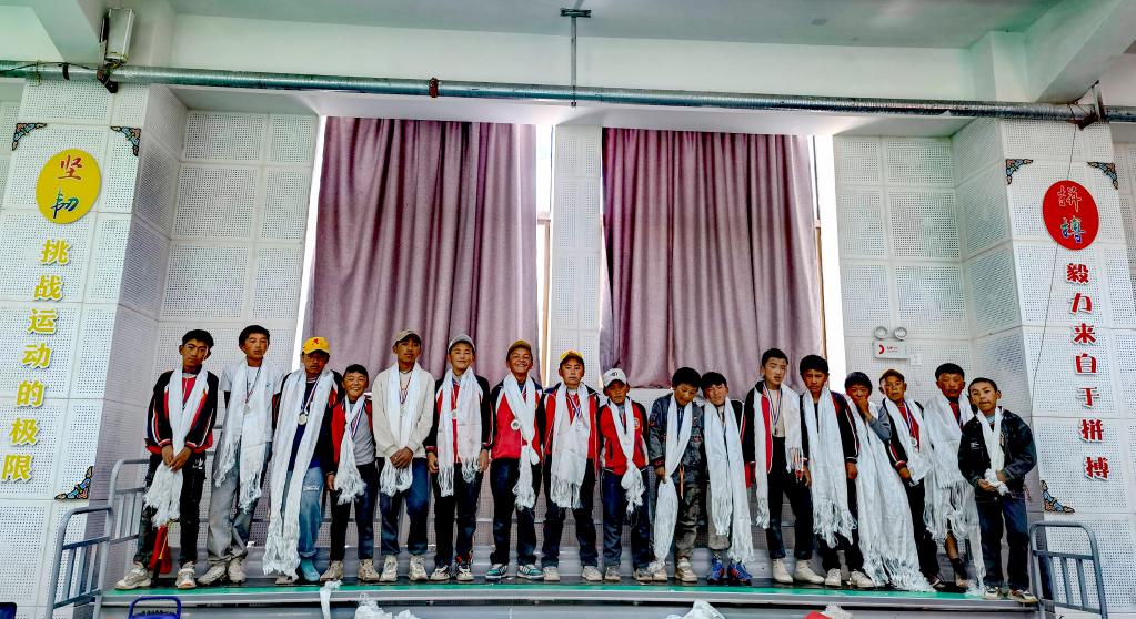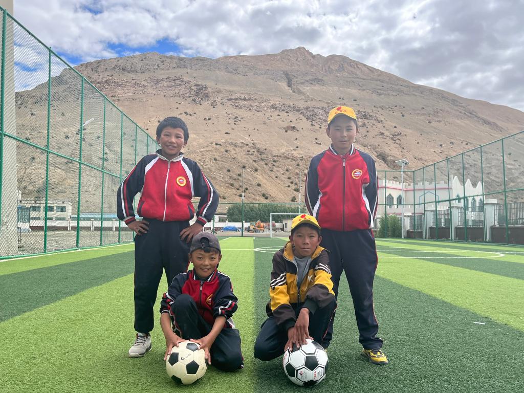 今年6月畢業前夕,格旦曲桑(前左)和同學在扎西宗鄉完全小學的足球場上合影留念