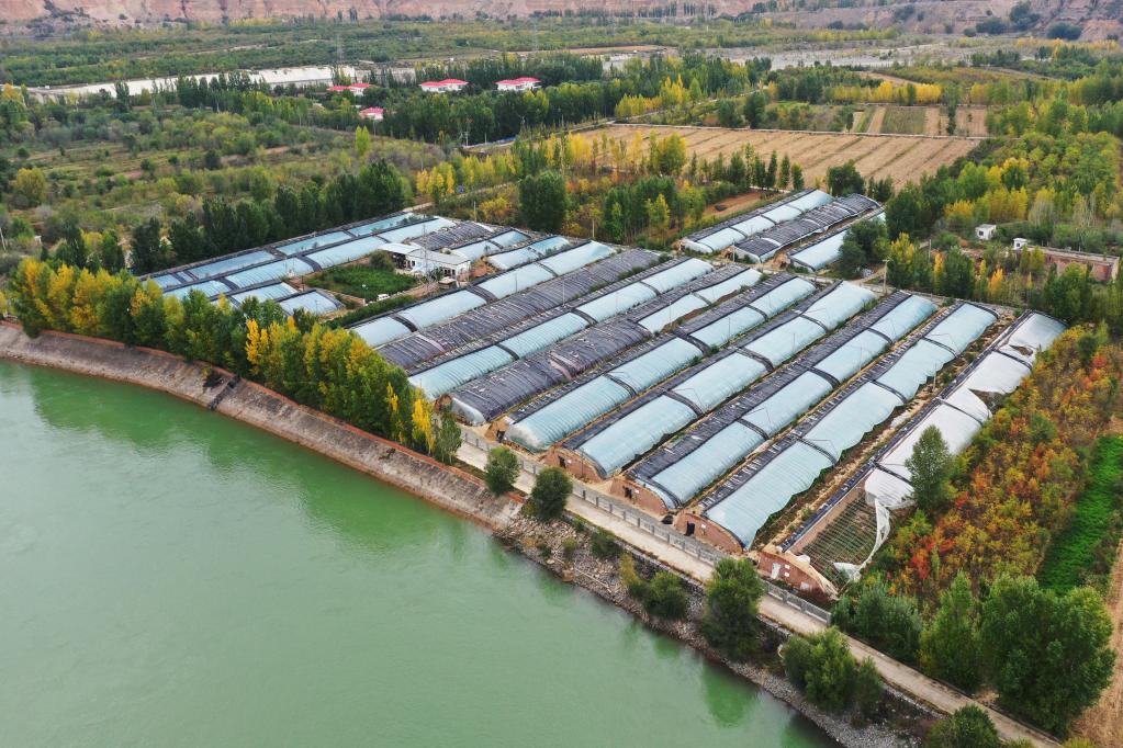 位于青海省黃南藏族自治州尖扎縣康楊鎮的溫室大棚(無人機照片)。新華社記者 陳杰 攝