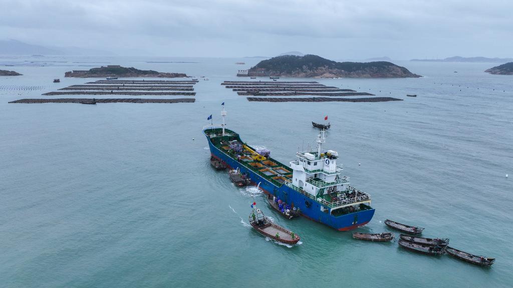 新華社福州11月27日電(記者龐夢霞 周義)近日,福建省連江縣苔菉鎮后灣海域熱鬧繁忙,漁民們正忙著將5萬多籠鮑魚從運輸船上卸下,再用小船運到漁排上,掛繩下海繼續養殖。