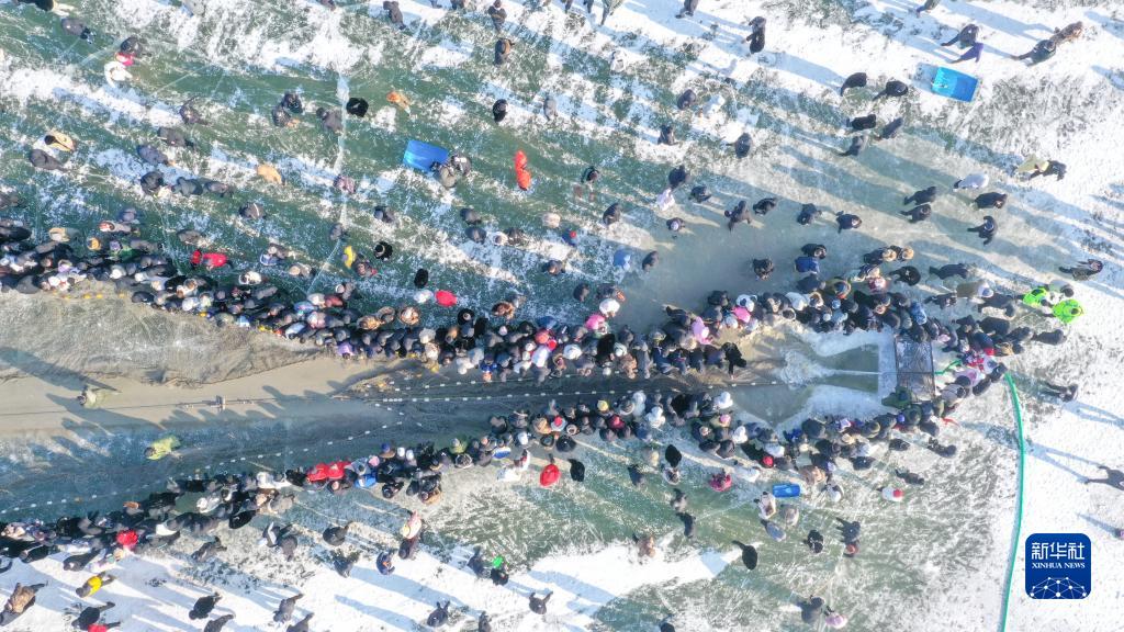 12月28日,在查干湖第二十一屆冬捕節現場,游客觀看祭湖醒網儀式(無人機照片)。新華社記者 張楠
