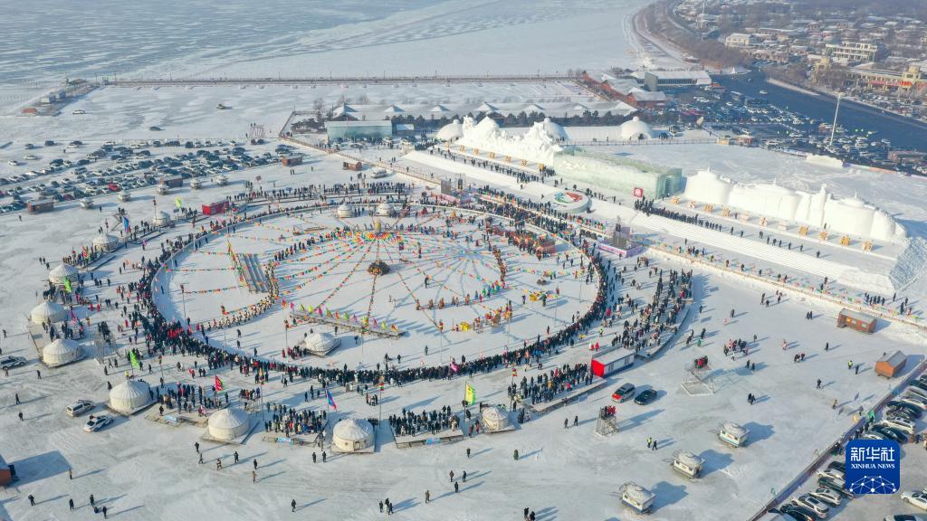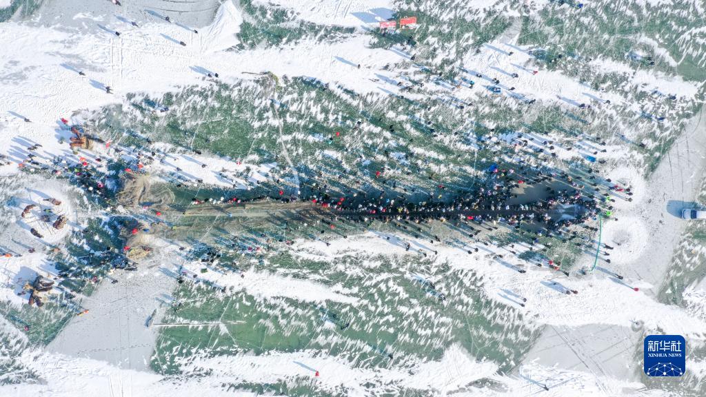 12月28日,在查干湖第二十一屆冬捕節現場,游客觀看祭湖醒網儀式(無人機照片)。新華社記者 張楠 攝