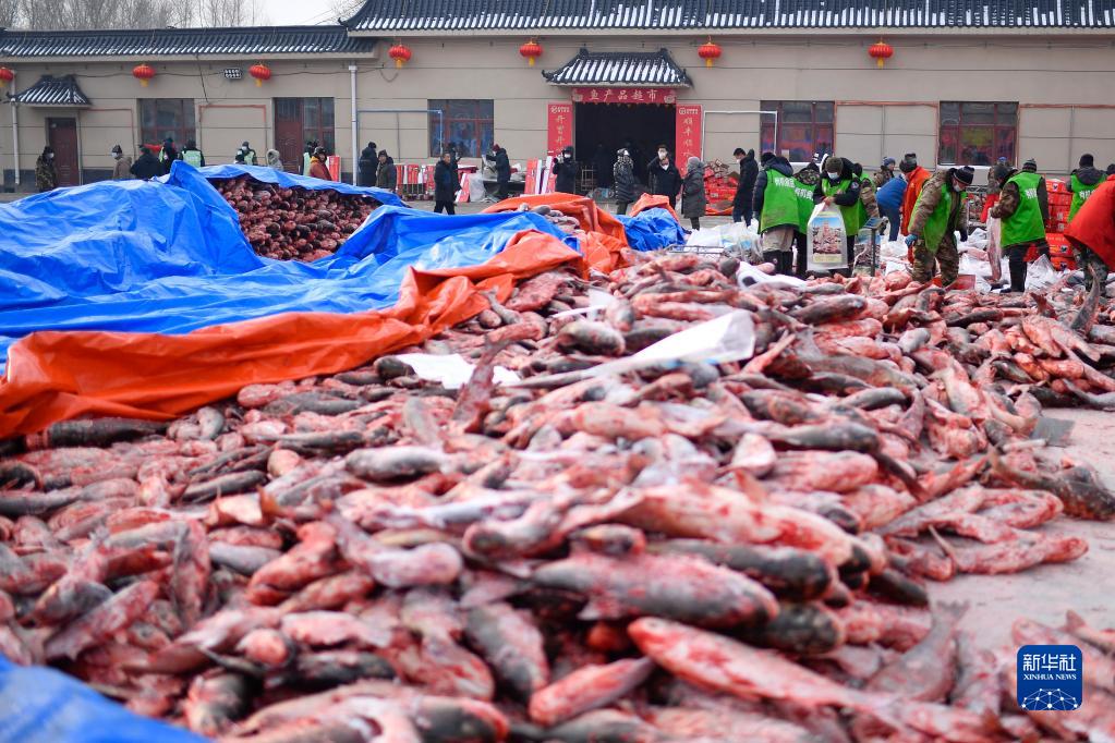 12月27日,查干湖魚產品超市的工作人員將各種魚類打包裝箱。新華社記者 許暢 攝