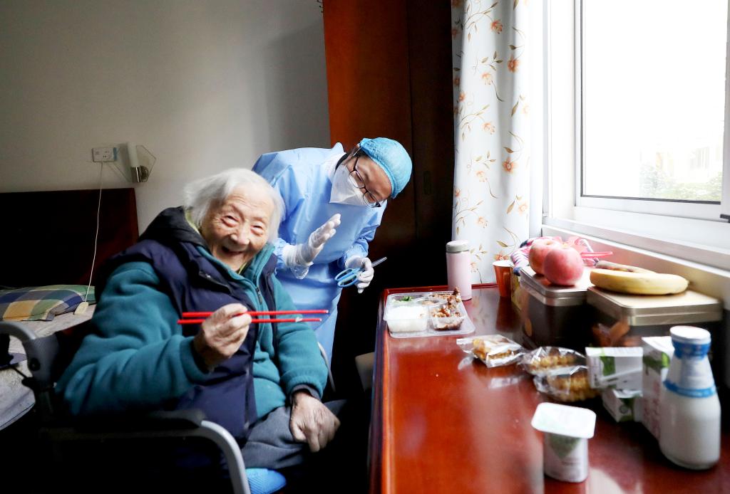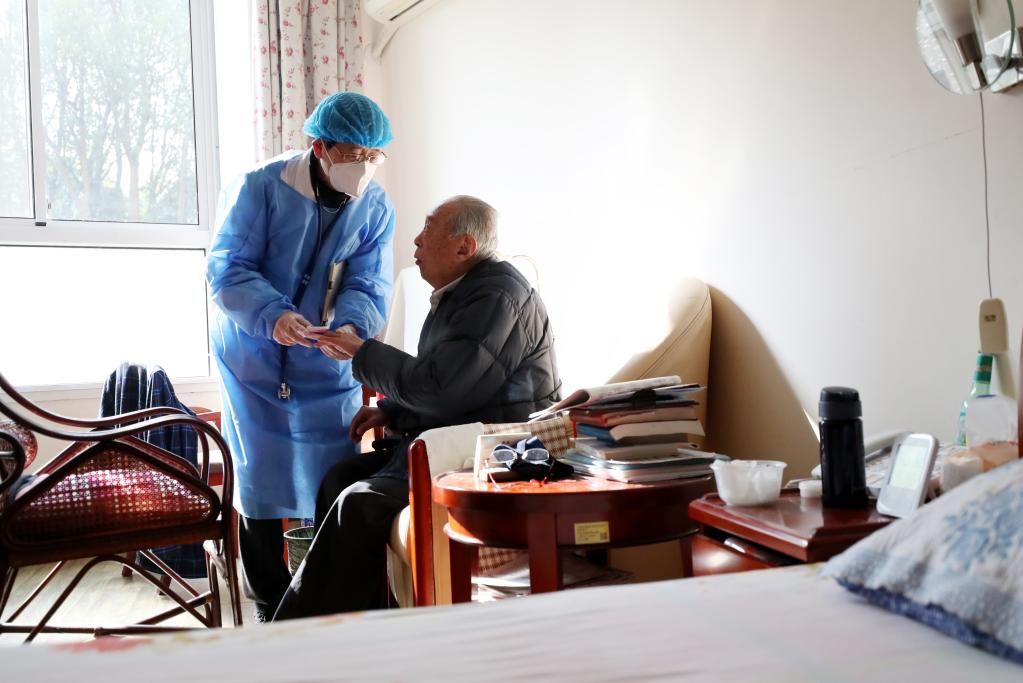 1月7日,在上海中福會養老院,駐院醫生彭?。ㄗ螅┙o老人做血氧監測。新華社記者 方喆 攝