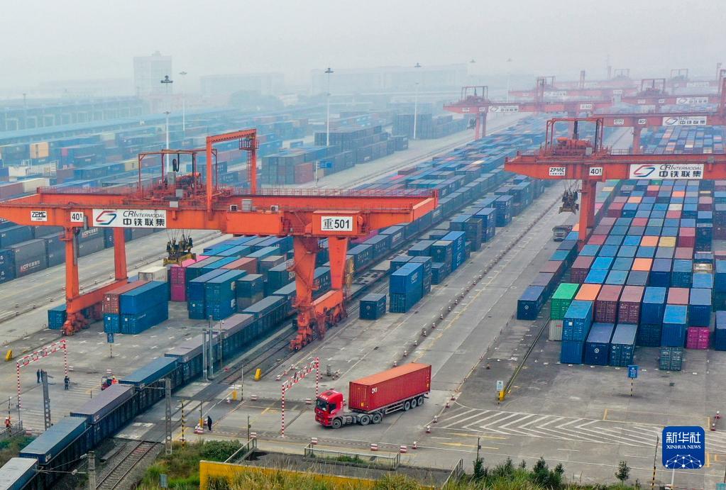 2022年12月30日,西部陸海新通道鐵海聯運班列在重慶團結村中心站等待發車。當日,兩列西部陸海新通道班列同時從成都和重慶發出,分別前往馬來西亞和泰國,標志著西部陸海新通道川渝總運量突破60萬標箱。 新華社記者 唐奕 攝