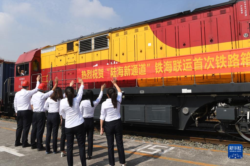 2019年9月2日,重慶團結村中心站陸海新通道鐵海聯運首次鐵路箱下海出境專列發車現場,工作人員向即將發車的專列揮手致意。 新華社記者 唐奕 攝