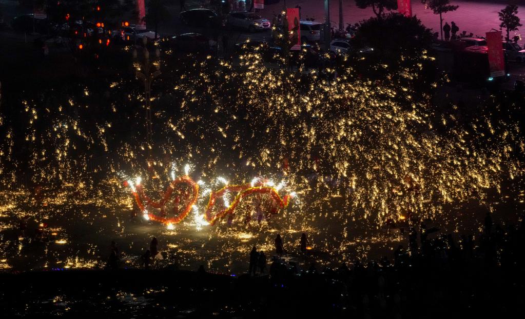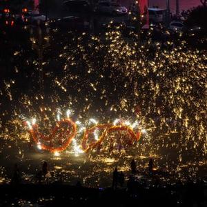 夜幕下,高亢激昂的音樂鳴奏不絕,一條火花四濺的金龍劃破長空,赤膊上陣的舞龍隊員舉著龍盤旋飛騰。燒至1500攝氏度的火紅鐵水高高潑灑到空中,剎那間,萬千流星墜落,猶如一樹樹金花在空中綻放。