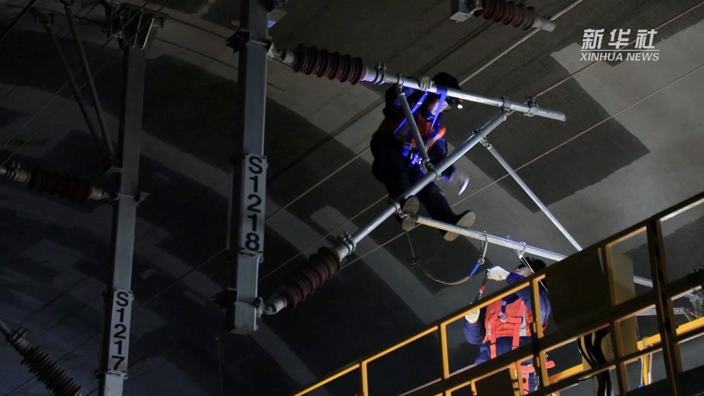 職工們每夜都要對高鐵接觸網關節式分相、隔離開關及引線等設備進行檢修,在高空守護鐵路安全暢通。