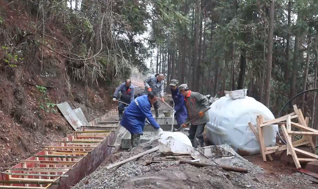湖南懷化方石坪村,工人正在進行排水灌溉渠道施工。視頻截圖