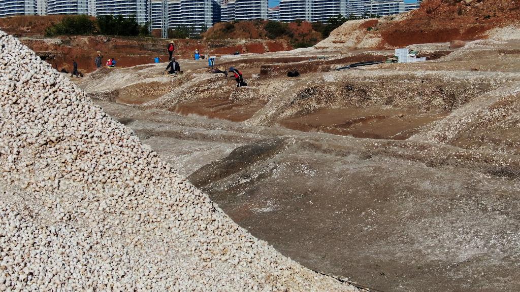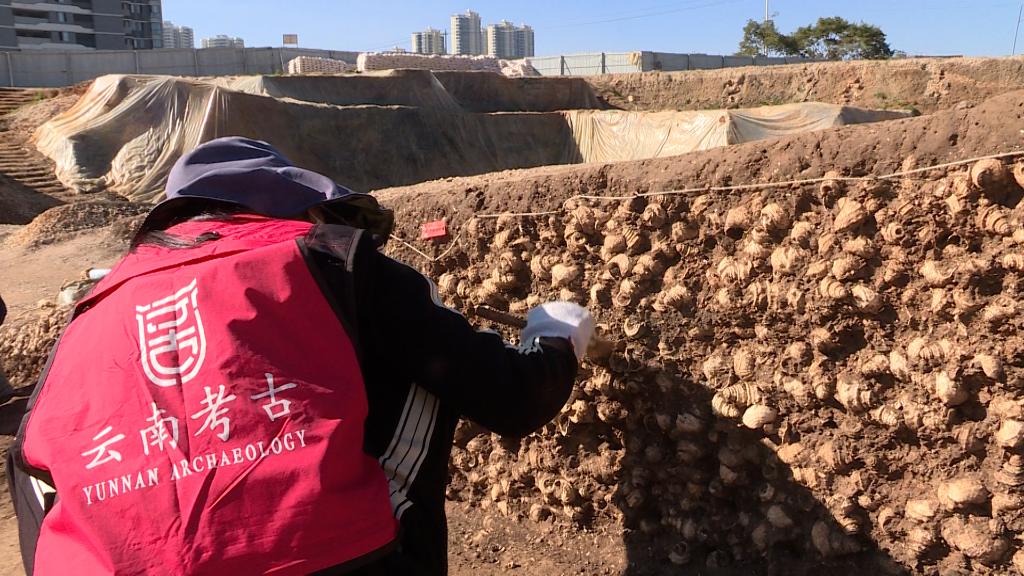 古城村遺址考古領隊、云南省文物考古研究所副研究館員周然朝介紹,古城村遺址是一處商周時期的大型湖濱貝丘遺址,面積約4.2萬平方米,現存的貝丘堆積最厚處達6.5米,由大量尾部被敲破的螺螄殼與灰土層交替堆疊形成。