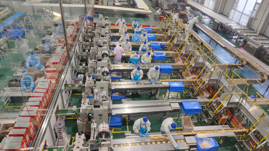 在海玉園的加工車間,工人們正在生產石頭餅。(新華社記者 王勁玉攝)