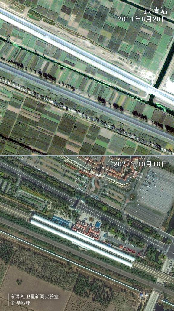 圖為衛星拍攝的順豐天津全自動中轉樞紐前后對比圖。