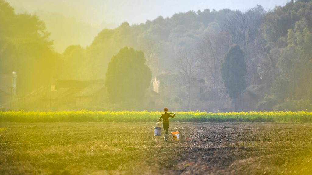 2月27日,湖南省常寧市西嶺鎮西沖村農民在田間挑運肥料。新華社發(周秀魚春 攝)