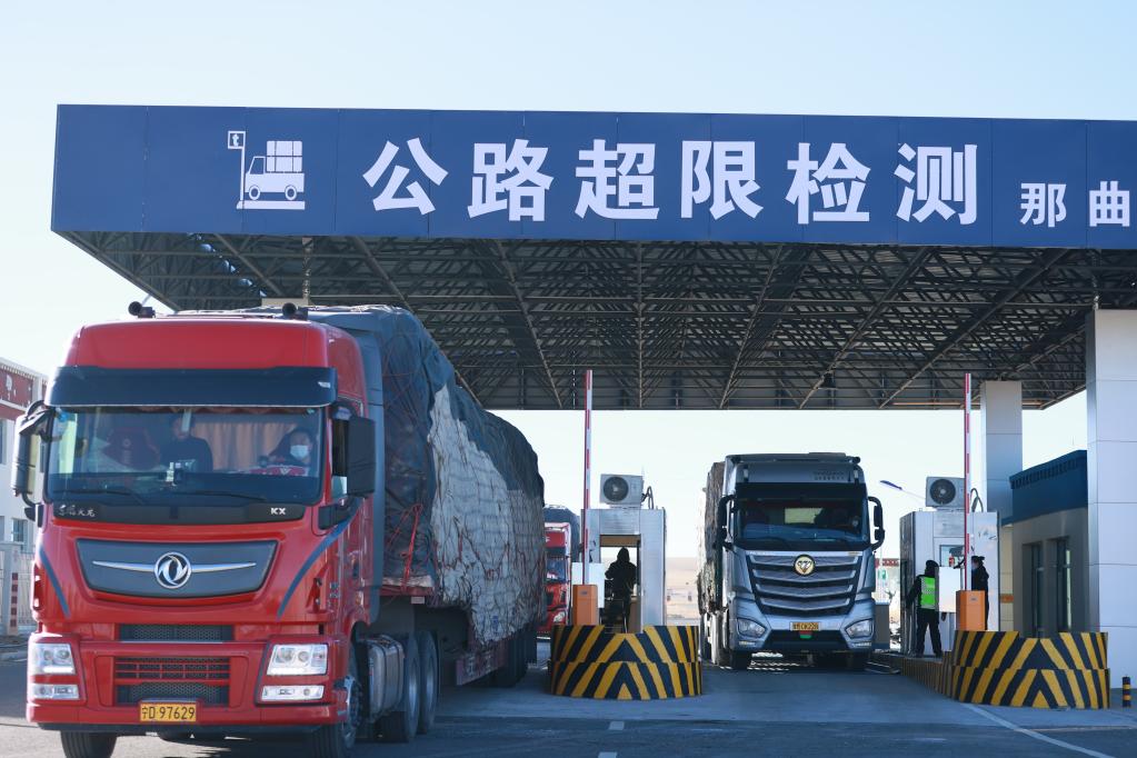 貨車正在通過那拉高速公路那曲超限檢測站。(西藏自治區交通運輸廳供圖)