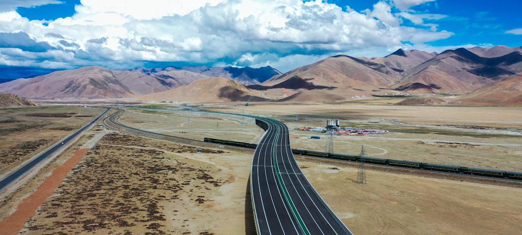 G6京藏高速公路那曲至拉薩段跨青藏鐵路特大橋。這條公路于2021年8月全線通車(無人機照片)。新華社記者 劉洪明 攝