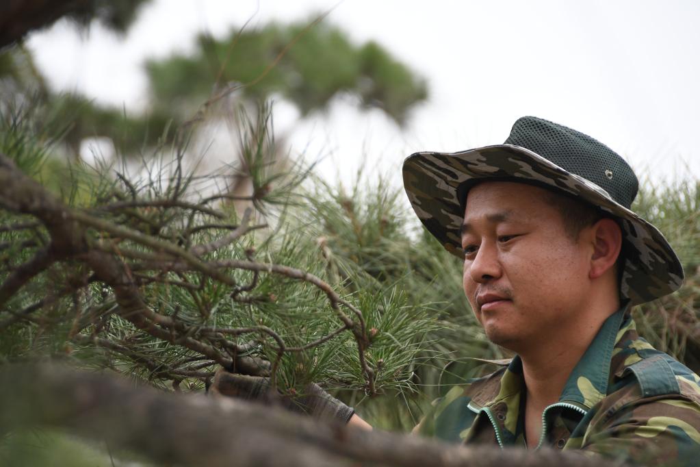 隨著從產到銷的鏈條逐漸完善,鏈條之上還連接著更多新興職業。在另一個攤位前,27歲的李森正在對一株高約60厘米的高山黃楊進行造型,只見他用鐵絲固定枝條,然后向一個方向扭轉、壓低,這株樹苗頓時就增添了神韻,造型后的身價也從幾百元升至上千元。