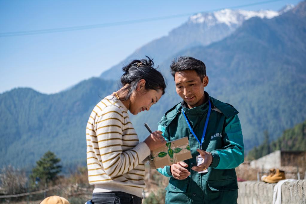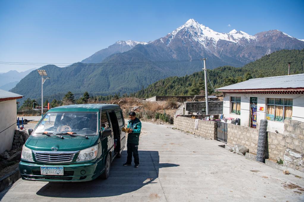 3月12日,在西藏吉隆縣沖色村,巴桑頓珠正在派件。新華社記者 孫非 攝