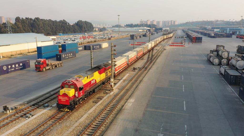 中老鐵路國際貨物列車從中鐵聯集昆明中心站駛出。(新華社發)