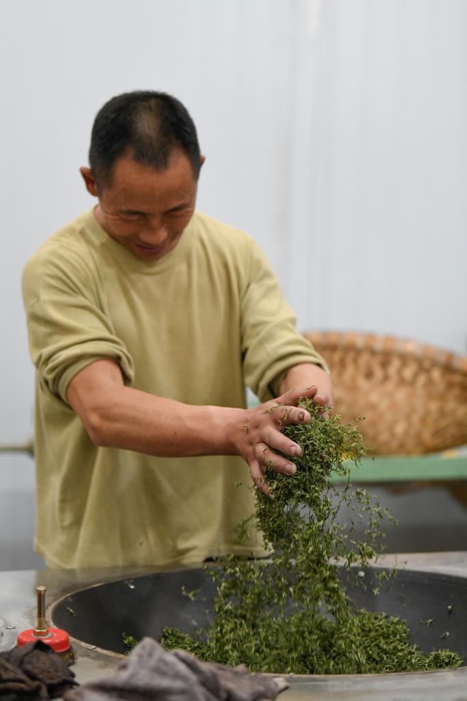 新店鎮茶葉集中加工園區一車間內,工人在制茶。新華社記者 胥冰潔 攝