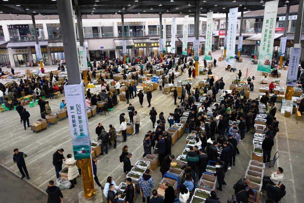 雅安市名山區雙河鮮葉交易市場內,茶農與茶企在進行鮮葉交易(無人機照片)。新華社記者 胥冰潔 攝