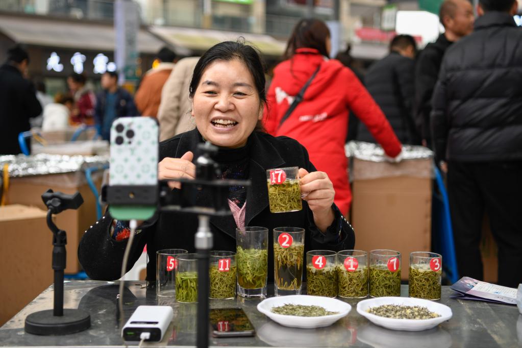 一位茶商在世界茶都茶葉交易市場內進行直播,為網友介紹自家茶葉特色。新華社記者 胥冰潔 攝
