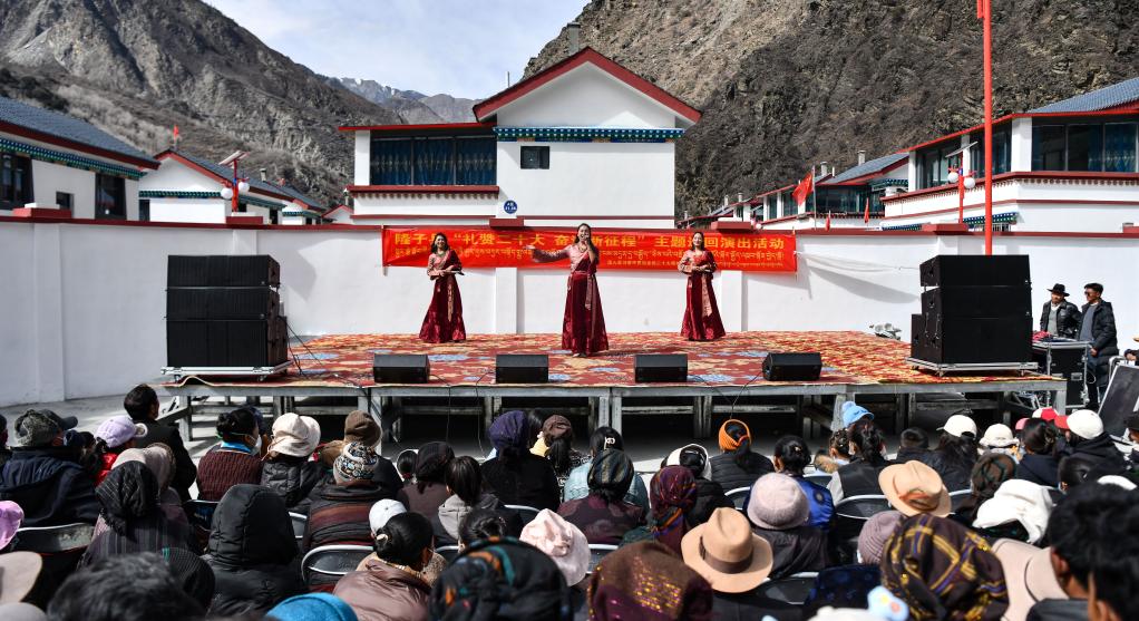 山南市隆子縣藝術團來到隆子縣斗玉珞巴民族鄉繞讓搬遷安置點開展藏歷新年文藝演出(2月15日攝)。新華社記者晉美多吉 攝