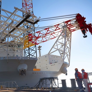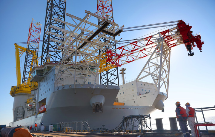 2022年12月20日,由江蘇啟東中遠海運海工為國外客戶訂制的N966自升式風電安裝船交付啟航。新華社發(許叢軍攝)