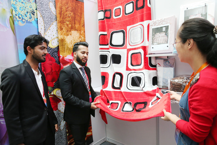 外國客商在“一帶一路”疊石橋進出口商品交易會上查看中國家紡產品。(資料照片,許叢軍攝)