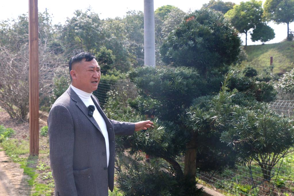 圖為鄧志平介紹基地里的苗木品種羅漢松。新華社記者 舒暢 攝