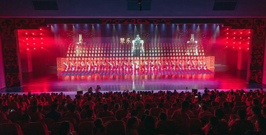 游客在方特東方神畫主題樂園里觀看《楚樂》表演。(周俊飛 攝)