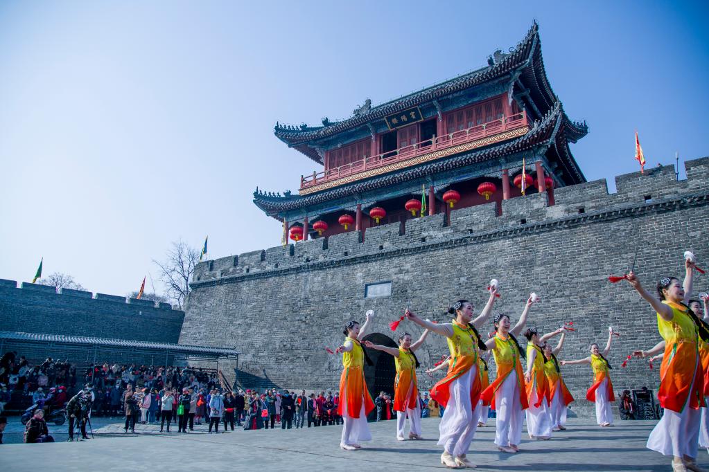 荊州古城歷史文化旅游區賓陽樓前,正在舉行文化活動。(張夢瑤 攝)