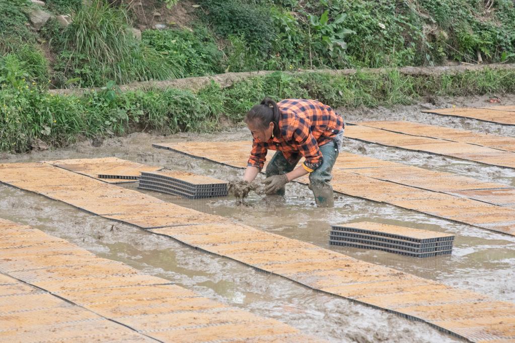 4月12日拍攝的貴州麻江縣宣威鎮咸寧村村民正在田中進行育秧擺盤。新華社記者羅羽 攝