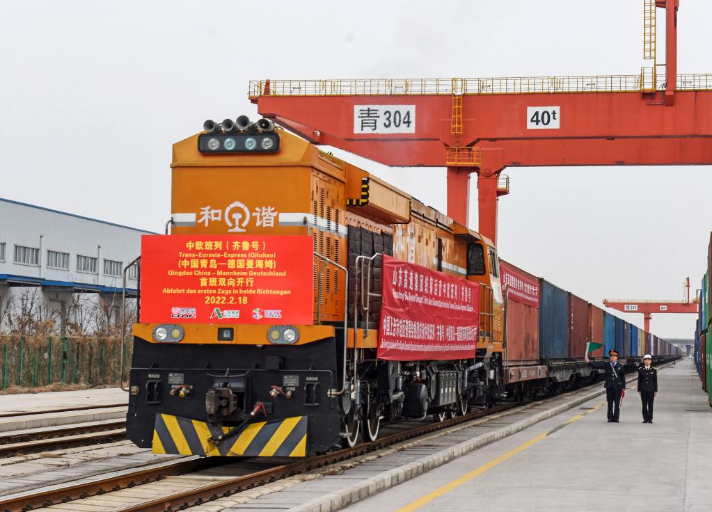 2022年2月18日,中歐班列(齊魯號)中國青島—德國曼海姆雙向對開首班列車從上合示范區青島多式聯運中心出發。新華社發(王昭脈攝)