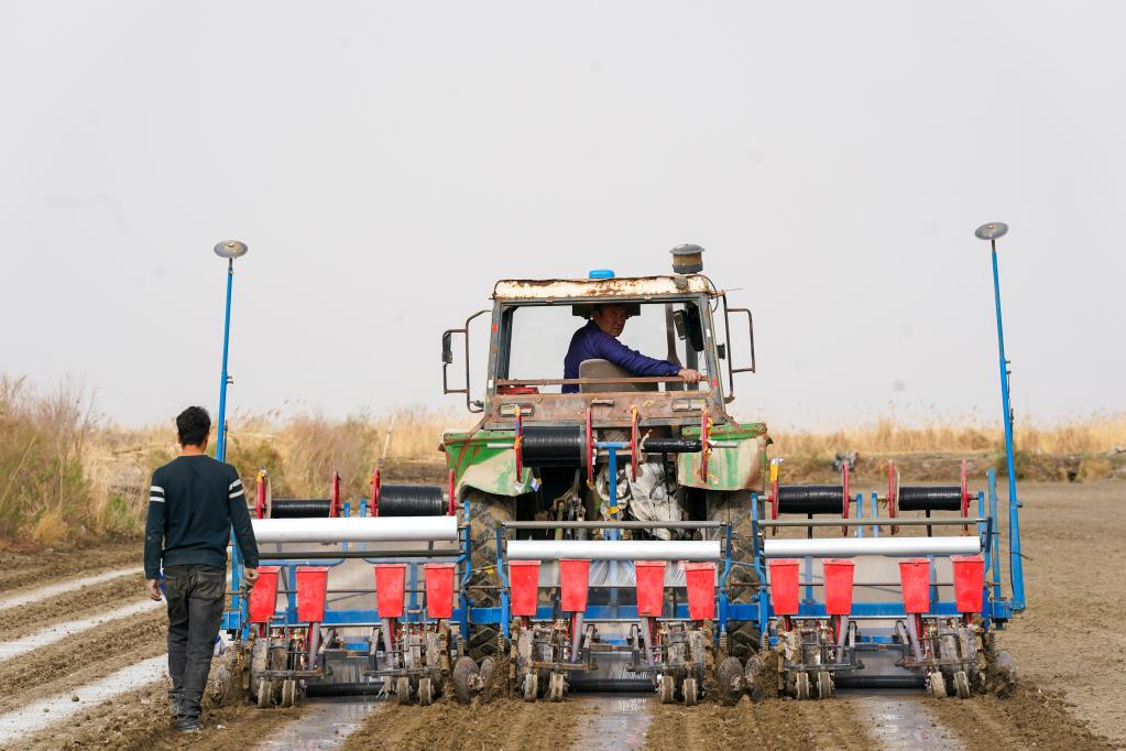 爾肯今年51歲,他播種的棉田位于新疆巴音郭楞蒙古自治州尉犁縣,地處塔克拉瑪干沙漠北緣。這里氣候干燥,光熱充足,是中國優質商品棉基地,每年棉花種植面積約100萬畝。爾肯種植棉花已經26年,是一位名副其實的“老”棉農。從最初的小塊地、小機械,發展到今年的近400畝,犁地、播種、管理、采收全程機械化。