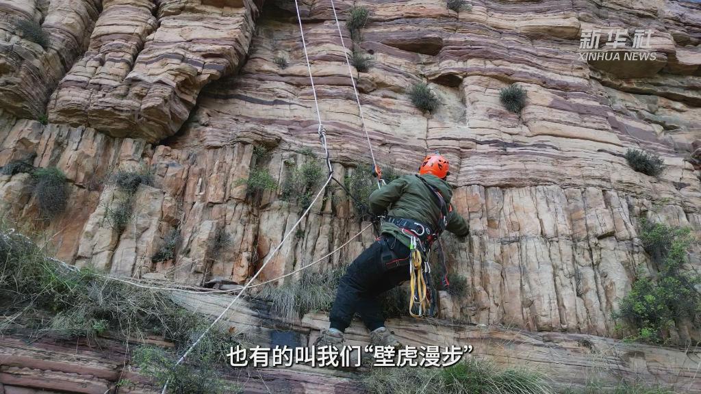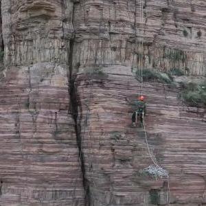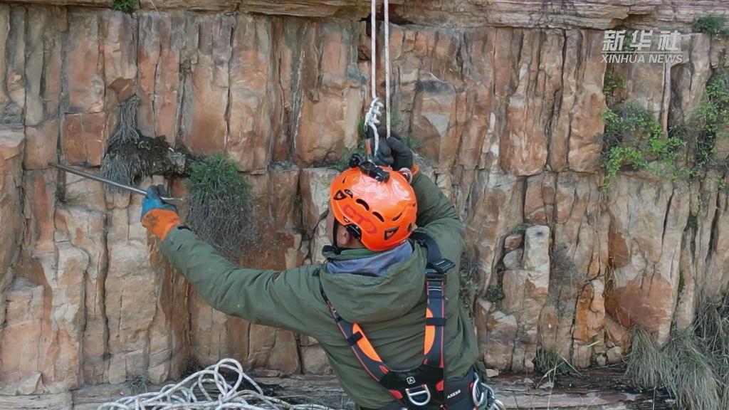 每次清危,都是一次真正意義上的攀巖運動,他們需要先用鐮刀扒開雜草,扛著繩索和沉重的裝備,艱難地從陡峭蜿蜒的山坡登上山頂,較遠的高崖光是爬上山頂就需要兩個多小時。登頂后,再從幾百米高的懸崖上把人吊放下來,懸在毫無依靠的半空中,然后在巖壁上攀爬、挪移,排除松動的石塊。