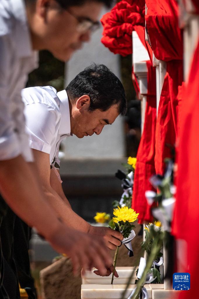 5月6日,參加安葬儀式的人員向烈士獻花致敬。新華社記者 胡超 攝