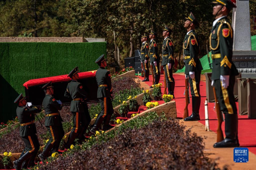 烈士陵園里,高聳的紀念碑引人注目。隨著烈士棺槨輕輕安放入墓,全體人員向烈士三鞠躬。隨后,現場的人們依次向烈士獻花致敬。