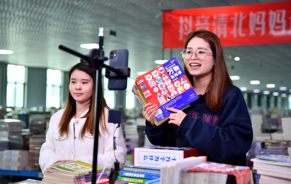 在河北永清經濟開發區京聯集團館配圖書聯合現采基地,工作人員在電商平臺直播銷售圖書。新華社記者 駱學峰 攝