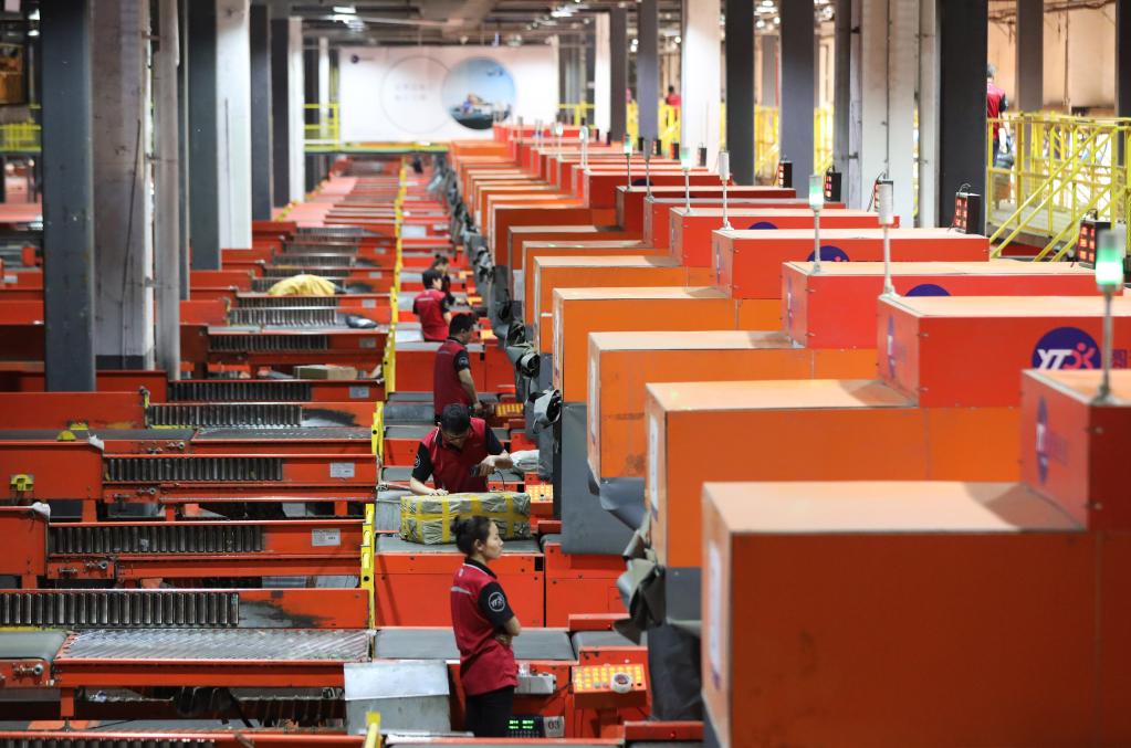在永清縣圓通速遞北方總部基地內,工作人員進行快遞卸車補碼作業。鄭晨子 攝