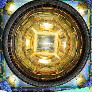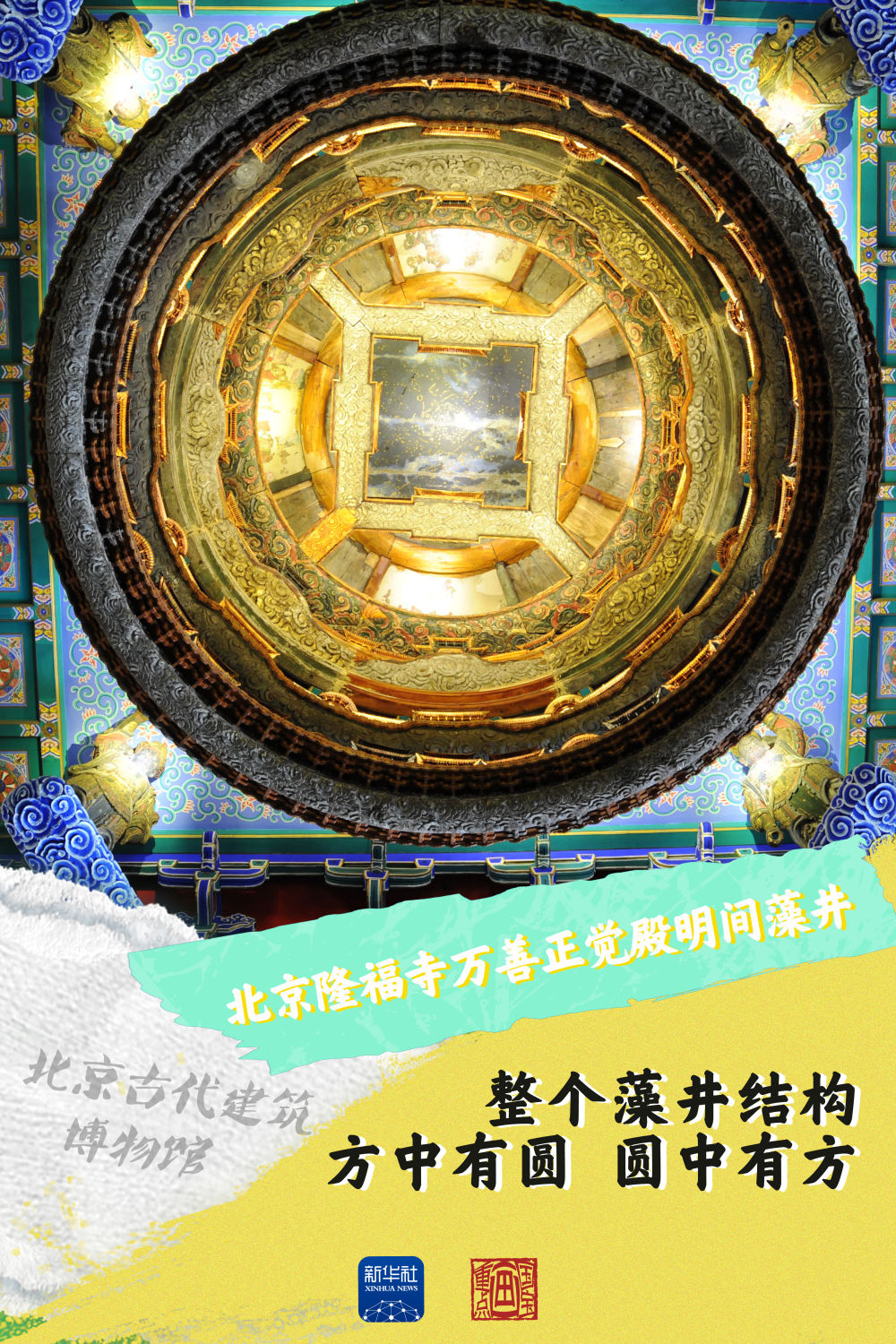 北京古代建筑博物館的鎮館之寶是這座美輪美奐的藻井,整個藻井的結構為方井內含圓井,圓井內又含方井。藻井四角立力士雕像,意在托起中心圓井。圓井應為六層框架,現存有五層,其中幾層之上布置有天上宮闕。宮闕里有精雕細琢的仙人天女,表情神態極為細膩。藻井的最上方是一幅星象圖,在燈光照射下宛若星河。