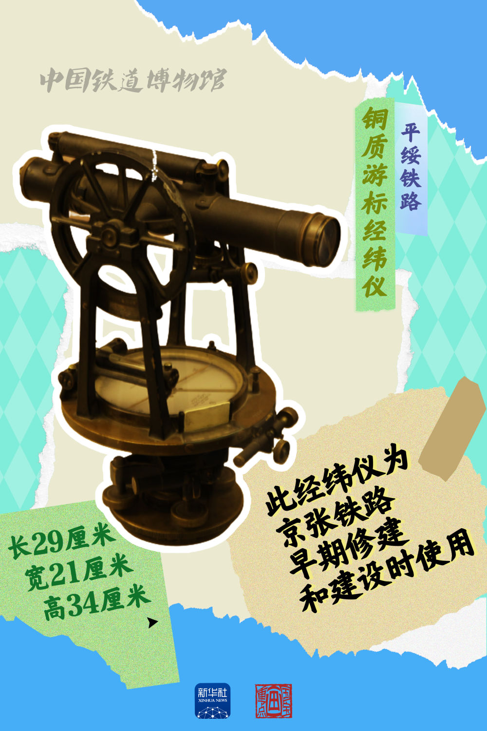 這件平綏鐵路使用的銅質游標經緯儀,為京張鐵路早期修建和建設時使用。該經緯儀制作精良,在當時屬于具有較高科學技術水平的設備。2009年張家口車務段將其捐贈給中國鐵道博物館正陽門展館。