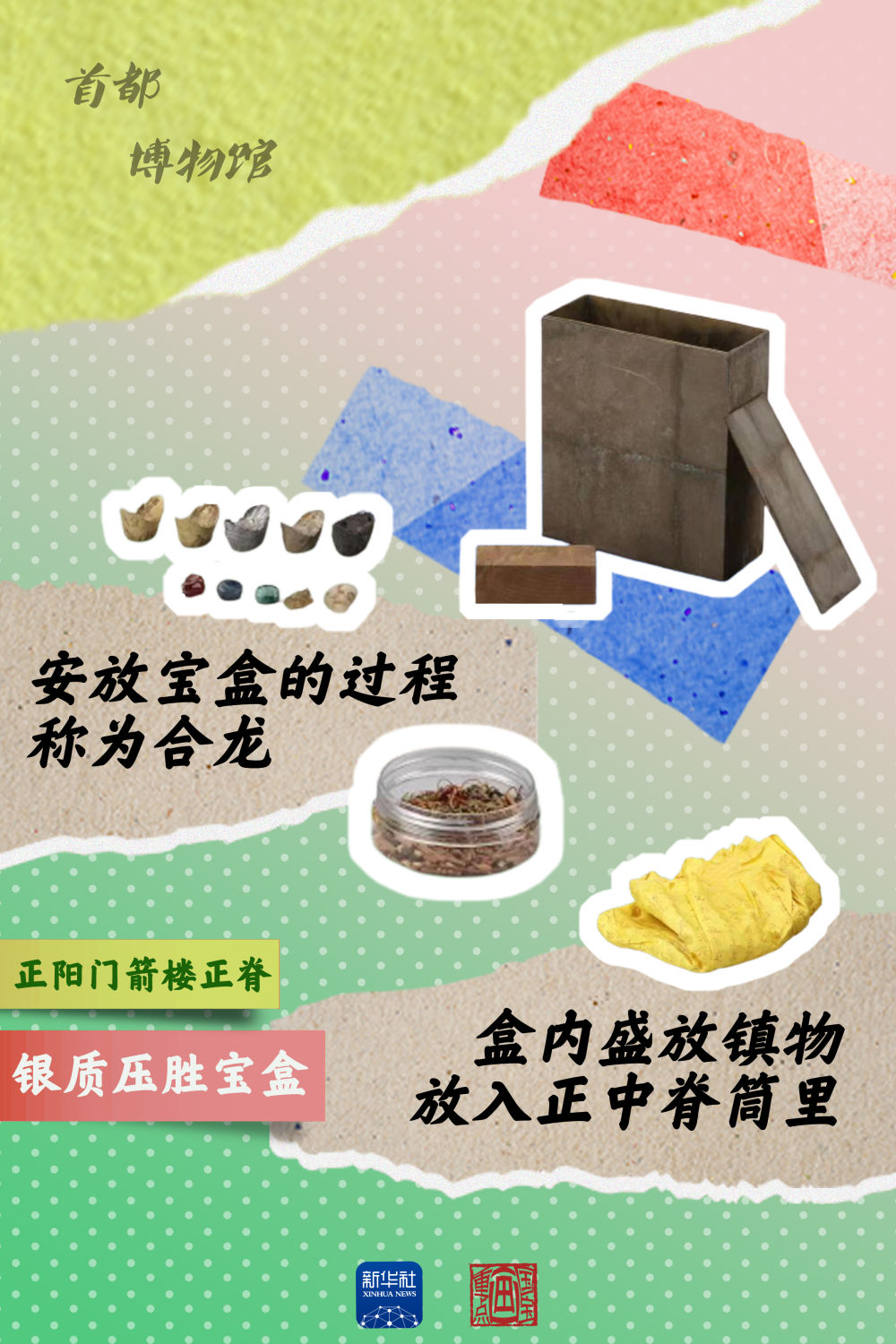 正在北京首都博物館舉行的“輝煌中軸”展覽上,正陽門正脊上銀質壓勝寶盒引人注目。這個從正陽門箭樓正脊取出來的寶盒,是能代表北京城市營造特色的文物之一。壓勝寶盒是規模較大的建筑在修建過程中,于正脊位置專門放置的盒子,有趨吉避兇的寓意。