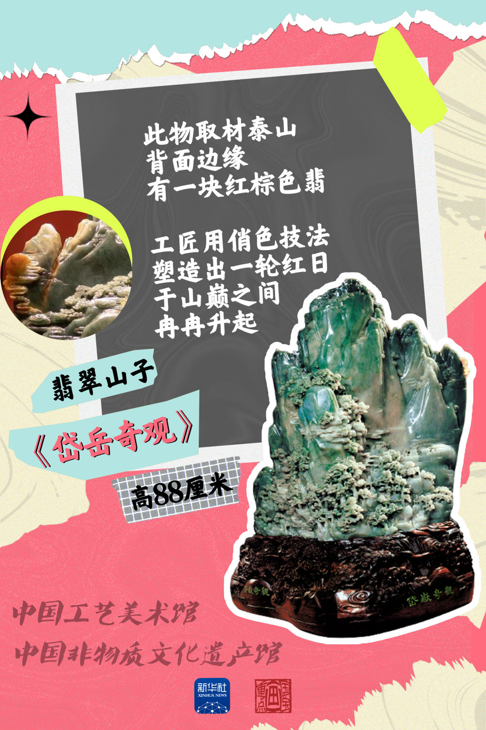 中國工藝美術館(中國非物質文化遺產館)館藏的翡翠山子《岱岳奇觀》讓人嘆為觀止,它采用鏤雕、圓雕、深淺浮雕等工藝手法,體現層層疊疊的樹木、小橋。中景、遠景采用淺浮雕、陰刻等手法,使之深遠。作品背面用鐵線篆體字刻唐代詩人杜甫的《望岳》,填以金色,風格古樸高雅,書法和工藝造型相映生輝。