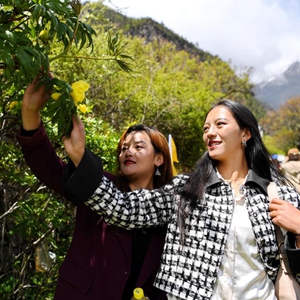 5月28日,兩名游客在米林市南伊珞巴民族鄉扎貢溝觀賞野生大花黃牡丹。新華社記者 張汝鋒 攝