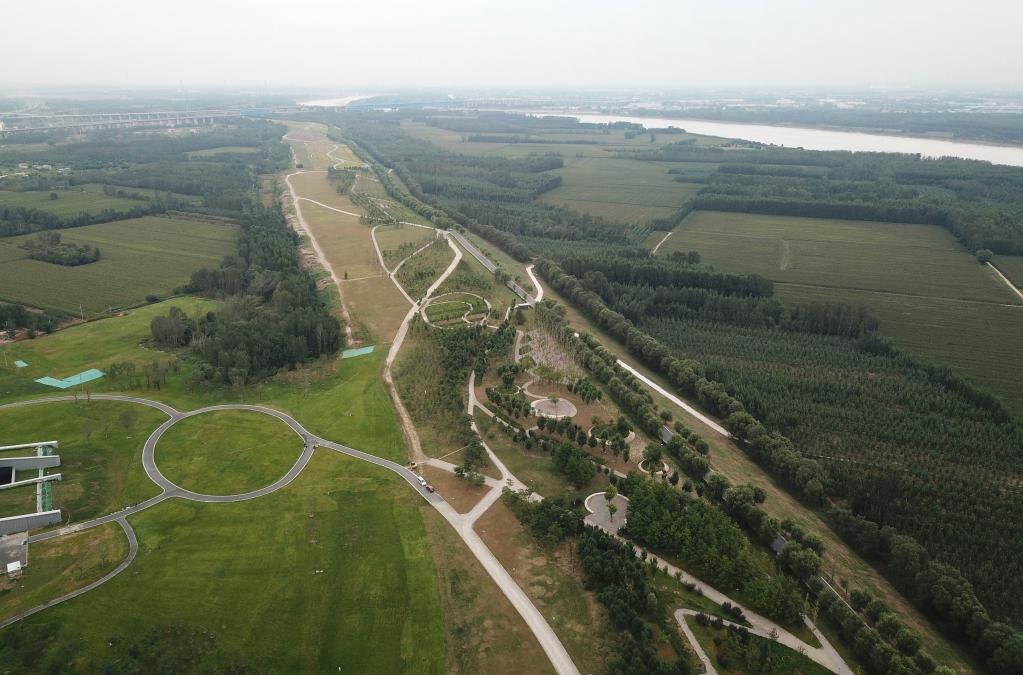 2022年9月9日拍攝的位于黃河濟南段沿岸的綠色生態景觀帶(無人機拍攝)。新華社記者徐速繪攝