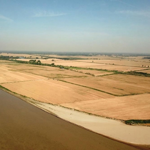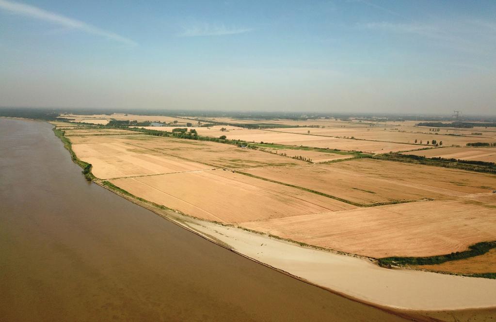 2022年6月7日,在山東省菏澤市東明縣的黃河沿岸麥田,聯合收割機在收割小麥(無人機照片)。新華社記者徐速繪攝