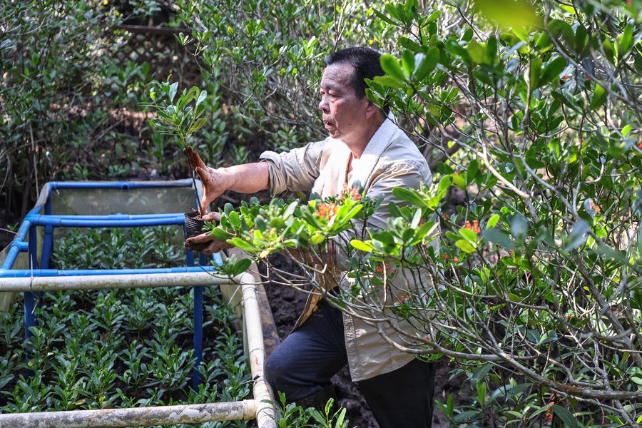 6月2日,王式軍在海南東寨港國家級自然保護區的苗圃內管護紅欖李幼苗。新華社記者 張麗蕓 攝