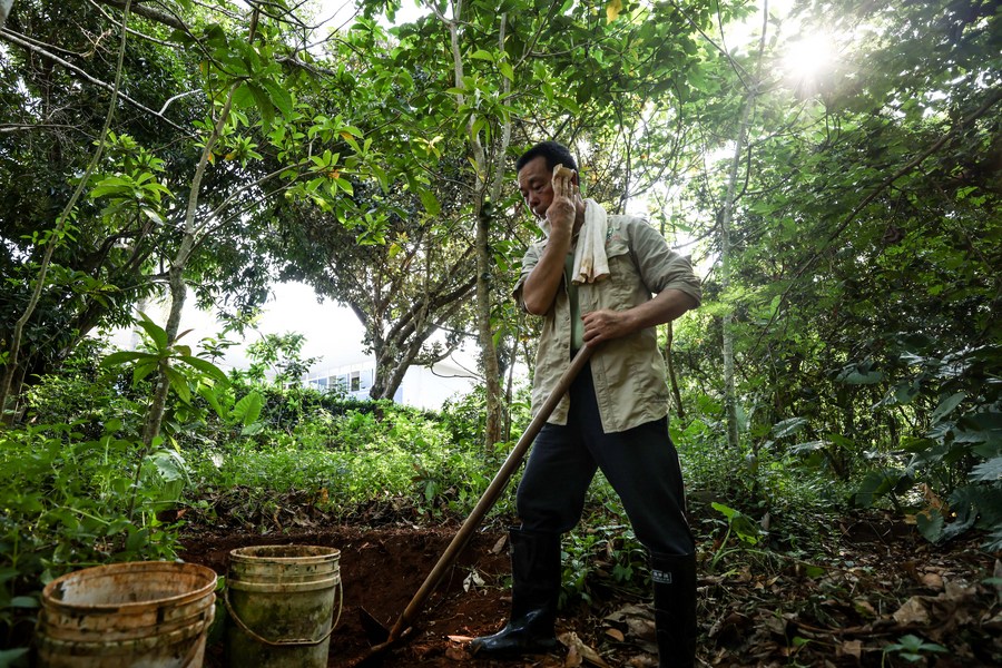 6月2日,在海南東寨港國家級自然保護區的苗圃內,王式軍在工作間隙擦拭汗水。新華社記者 張麗蕓 攝