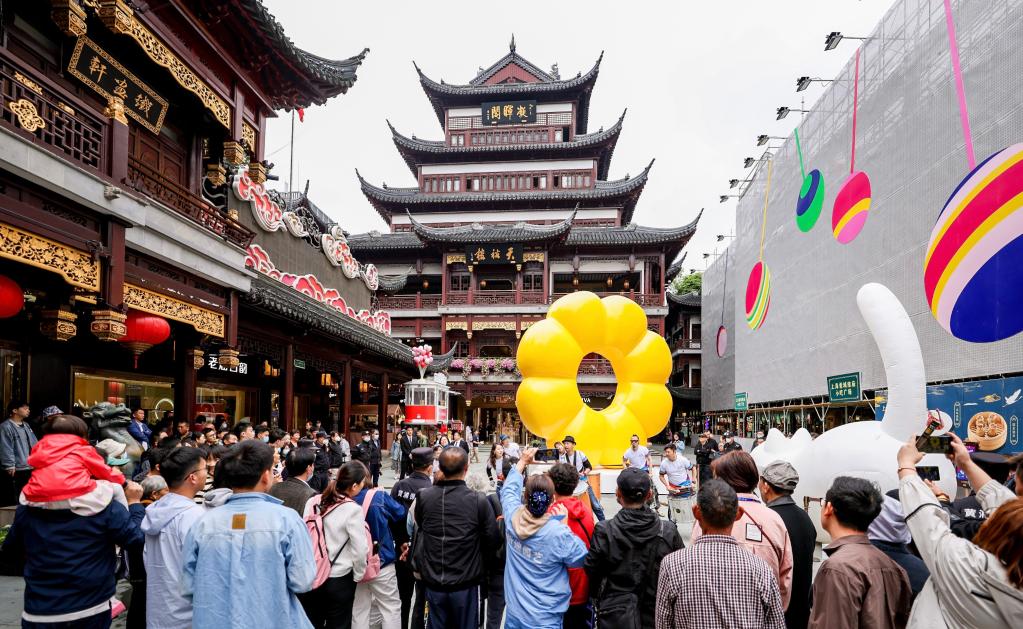 上海市民游客在上海豫園商城中心廣場觀看街頭藝術表演(2023年5月7日)。新華社記者劉穎 攝