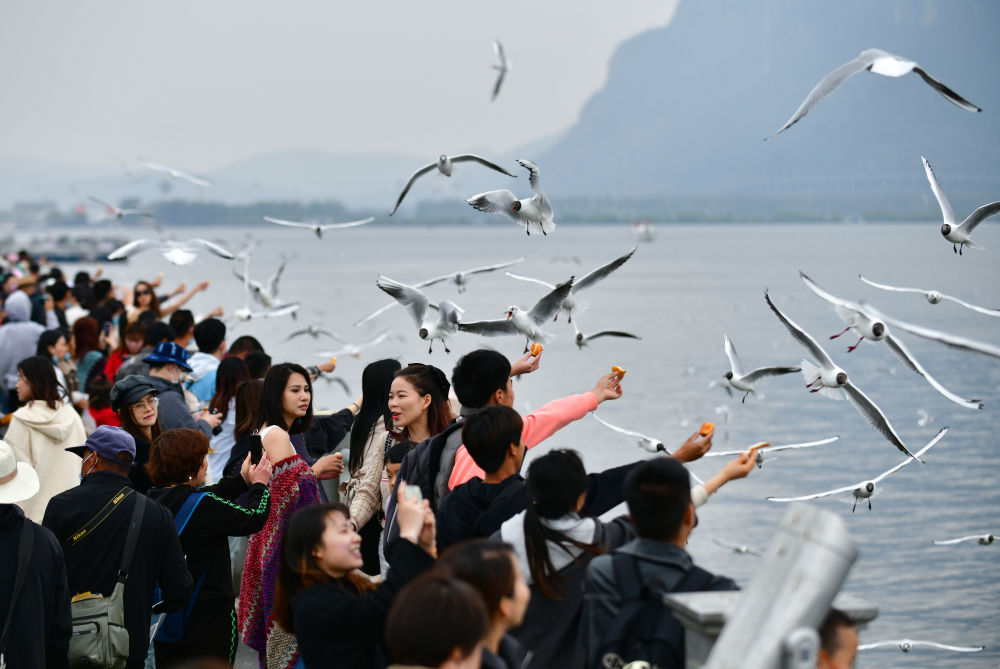 3月12日,游客在昆明海埂大壩喂紅嘴鷗。新華社記者陳欣波 攝